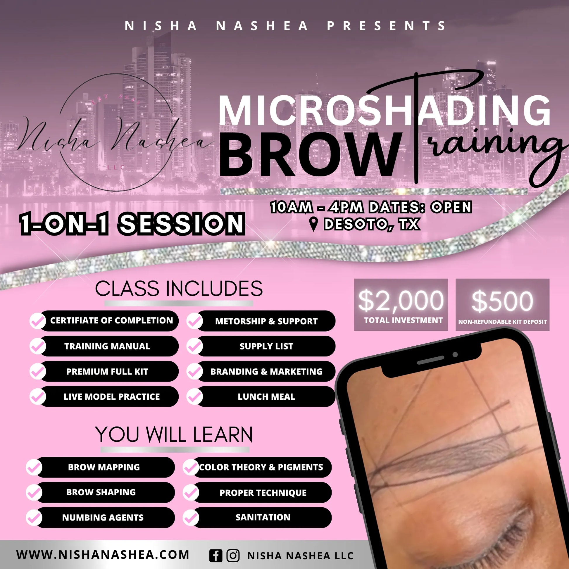 In this comprehensive training, offered as a personalized 1-on-1 session or in a small group setting for up to 4 individuals, you will delve into the art of Microshading focusing on Ombré Brows under the expert guidance of Nisha Nashea. Enhance your skills in Eyebrow Shaping, Eyebrow Mapping, Sanitation practices, Color Theory, Branding, Marketing strategies, Picture Taking techniques, and Digital Consent Forms management.
